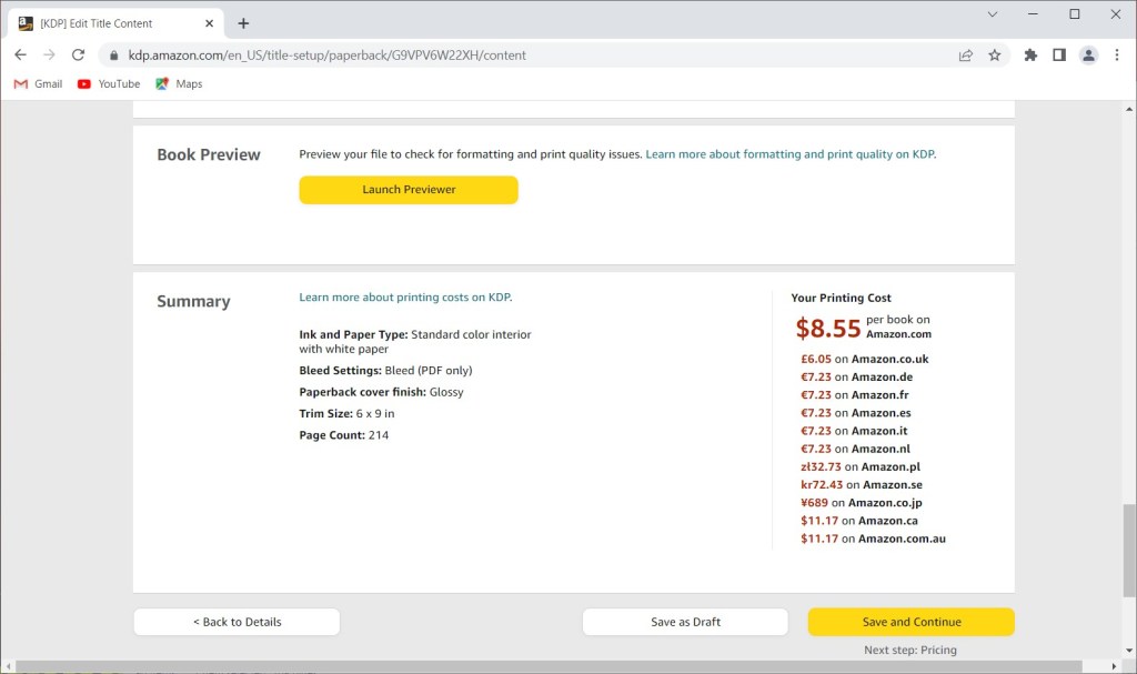 So, you’ve written a book. You converted your Microsoft Word document or other document to a pdf file that is fit for printing as a book as shown in the images below. There are tools for doing this (like Adobe InDesign), but as a first-time author you may need help with this. You uploaded the file to Amazon KDP, and you uploaded the image files corresponding to the front cover and the back cover. You purchased an ISBN number for your printed book and the e-book version. You have a barcode.