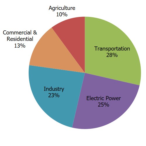 The origins of the world’s carbon emissions are: 25% Electricity and Heat, 24% Agriculture and Forestry, Industry 16%, Transport 14%, direct from buildings 6%, and other energy 10%. In the US Transportation is 28% and Agriculture 10%. Agriculture includes the effects of deforestation.